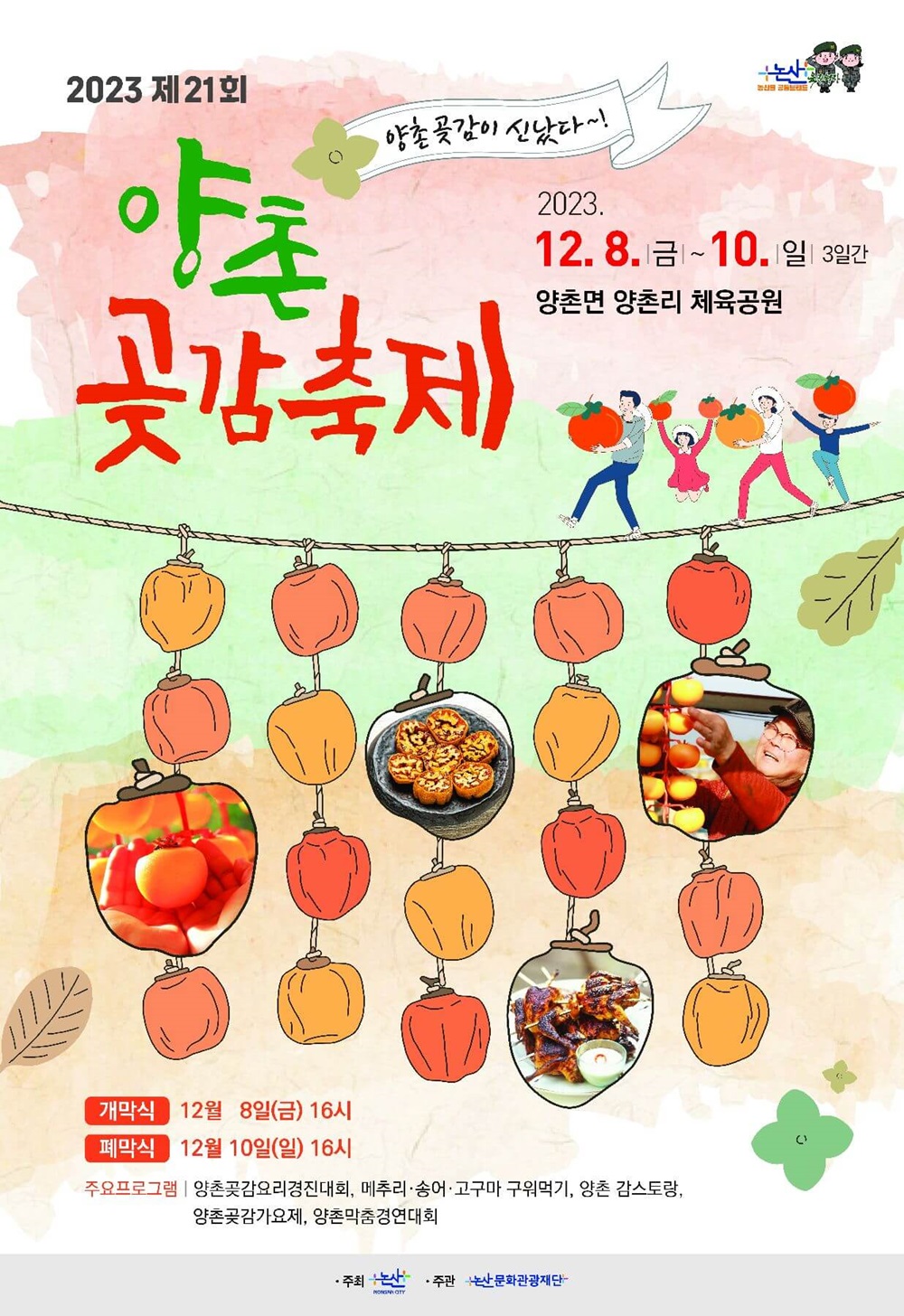 다가오는 평일에 논산에서 제21회 양촌곶감축제가 개최된다고 합니다. 많은 체험 프로그램과 시식 등 다양한 이벤트가 예정되어 있으니 확인하시고 재밌는 축제 다녀오세요.