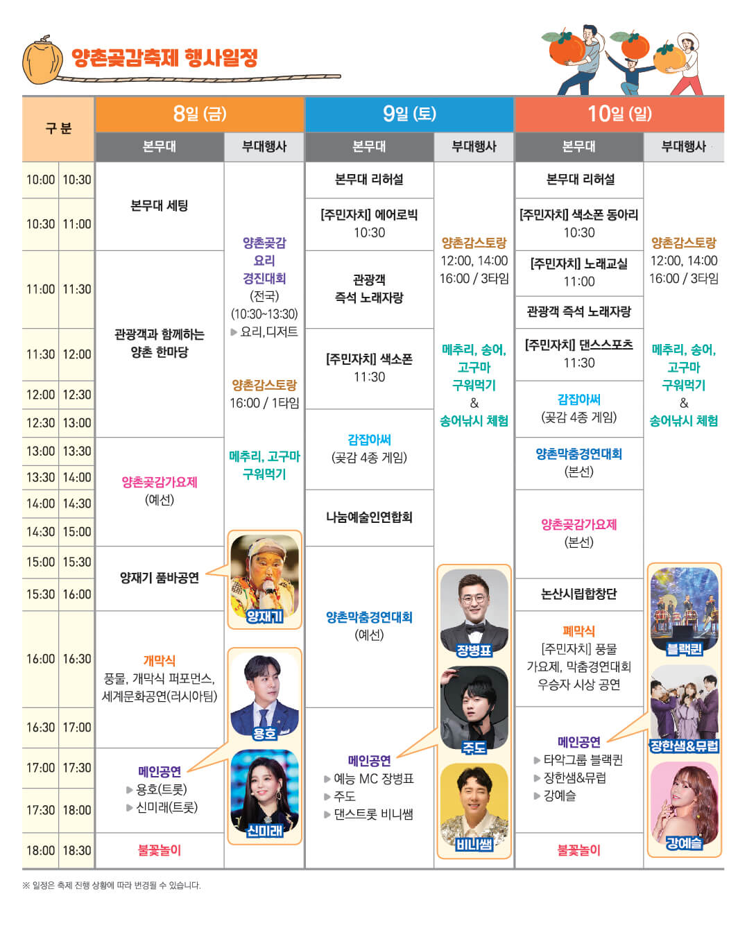 프로그램은 양촌곶감요리경진대회, 메추리송어고구마 구워먹기, 양촌 감스트랑, 양촌곶감가요제, 양촌 막춤경연대회 등